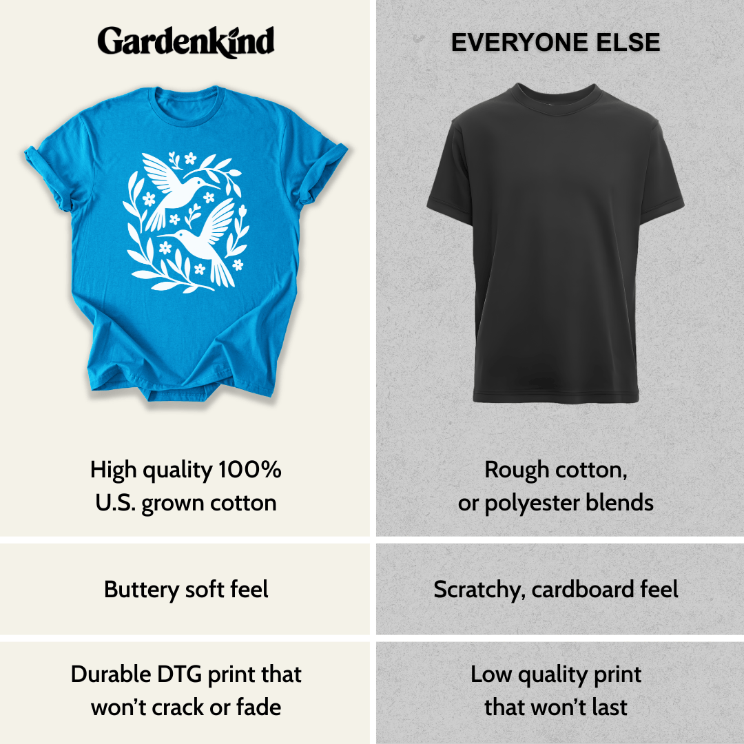 We don’t do stiff, scratchy shirts. Our tees are 100 percent ring spun cotton — soft, breathable, and comfortable. Lightweight enough for sunny days, durable enough for the garden and beyond.